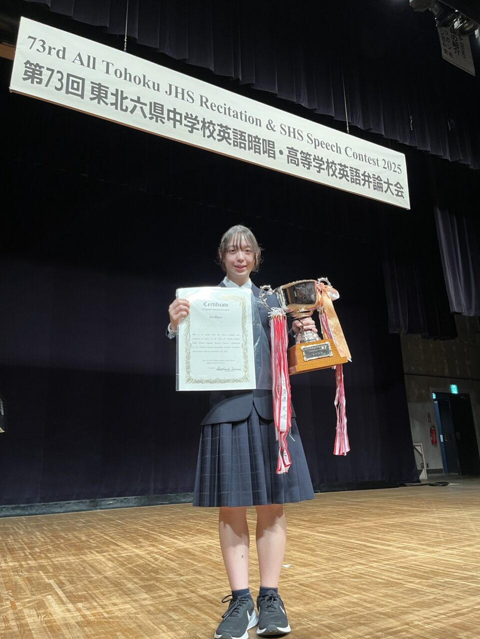 11月7日(金)に秋田県大館市で行われた「第73回東北六県高等学校英語弁論大会」で本校生徒が第一位を受賞しました。2026年2月に行われる全国大会に東北代表として出場します。おめでとうございます!全国大会でも平常心で持てる力を発揮できることをお祈りしています。