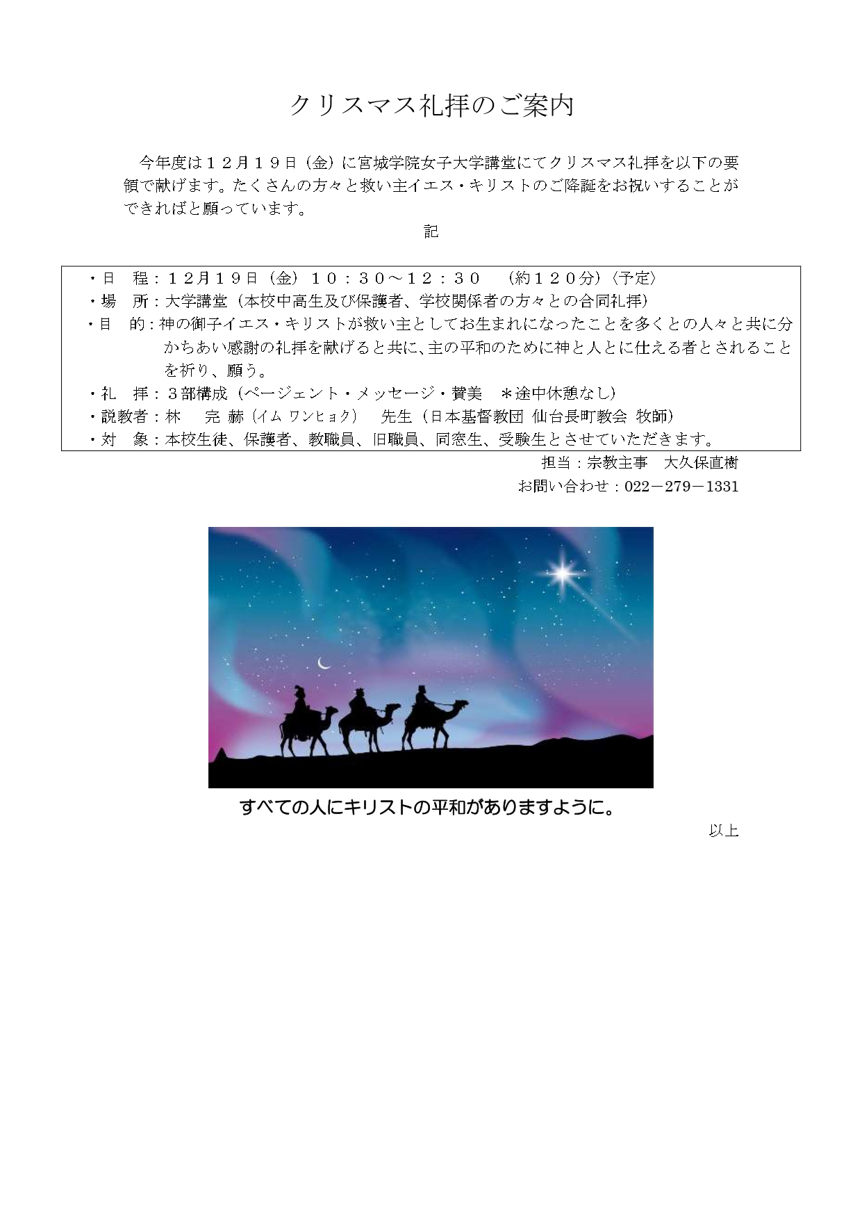 12月19日(金)10:30~12:30(約120分)にクリスマス礼拝を行います。場所は大学講堂。入場は本校在学生に加えて、保護者、教職員(含む旧職員)、同窓生、宮城学院中学校高等学校の受験を考えている方(含むその保護者)とさせていただきます。詳細は添付画像を合わせてご参照ください。