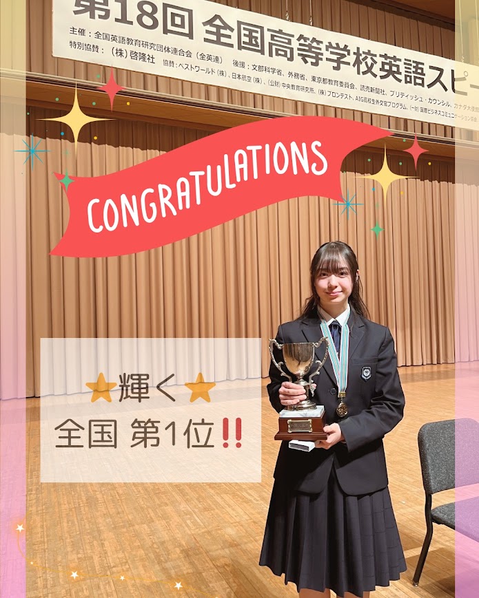 国立オリンピックセンターで開催された全英連主催第18回全国高等学校英語スピーチコンテスト(第2部)で、高2リーダー歩実さんが第1位を受賞しました。身近な課題解決のために実践した経験を述べたリーダーさんのスピーチが第1位に選ばれたことは大変意義深いです。本当におめでとうございます。