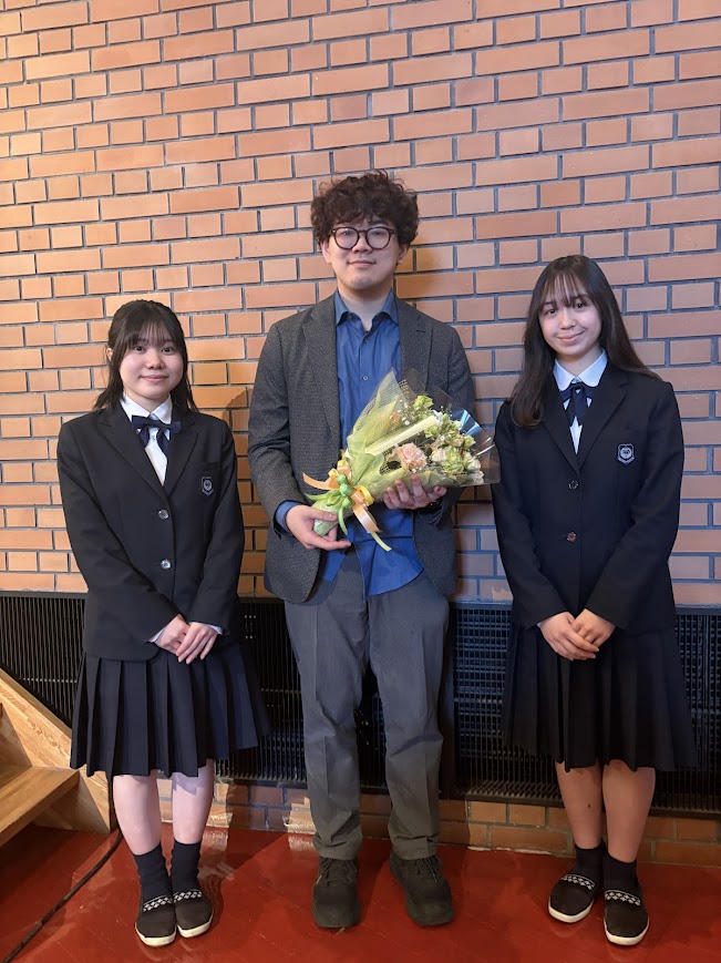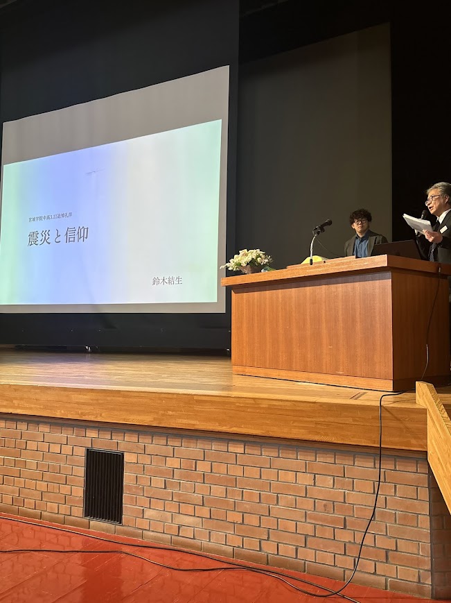 3月11日、本校では「3.11追悼礼拝」を行いました。今年は2025年に芥川賞を受賞した鈴木結生さんに「震災と信仰」と題してご講演をいただきました。小学校3年生のときに福島県郡山市で被災した当時の記憶も徐々に失われていく中で、当時の人が書いた文章を読むことで被災者の思いを受け継いでいくことができると伝えてくださいました。金丸真先生(仙台長命ヶ丘キリスト教教会牧師・本校聖書科講師)との対談では「1年で1000冊本を読んだのは本当ですか」「キリスト教や聖書と出会ったのはいつですか」など、生徒のみなさんからのたくさんの質問をとても楽しく興味深い貴重なお話を聞くことができました。