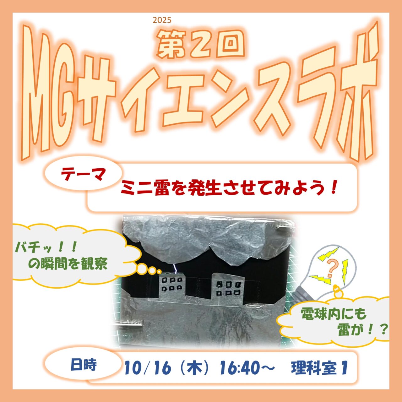 10月16日(木)午後4:30より、宮城学院中学校の理科室1にて放課後実験教室MGサイエンスラボを開催します。今回のテーマは「ミニ雷を発生させてみよう!」です!このイベントは本校に在籍する中学生向けの設定となっておりますが、小学生の皆さんも参加することができます!参加を希望する場合は下のボタンよりお申込みください!皆様のお越しをお待ちしております!
